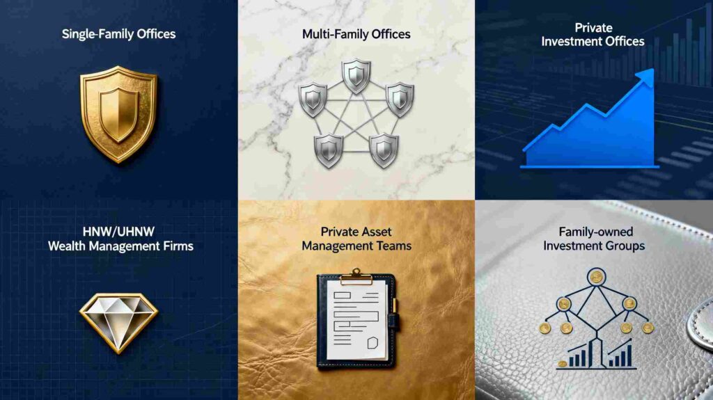 Multi-Family Offices provide investment and wealth management services to multiple wealthy families. They handle portfolio management, financial planning, and asset allocation for several HNW and UHNW clients.
